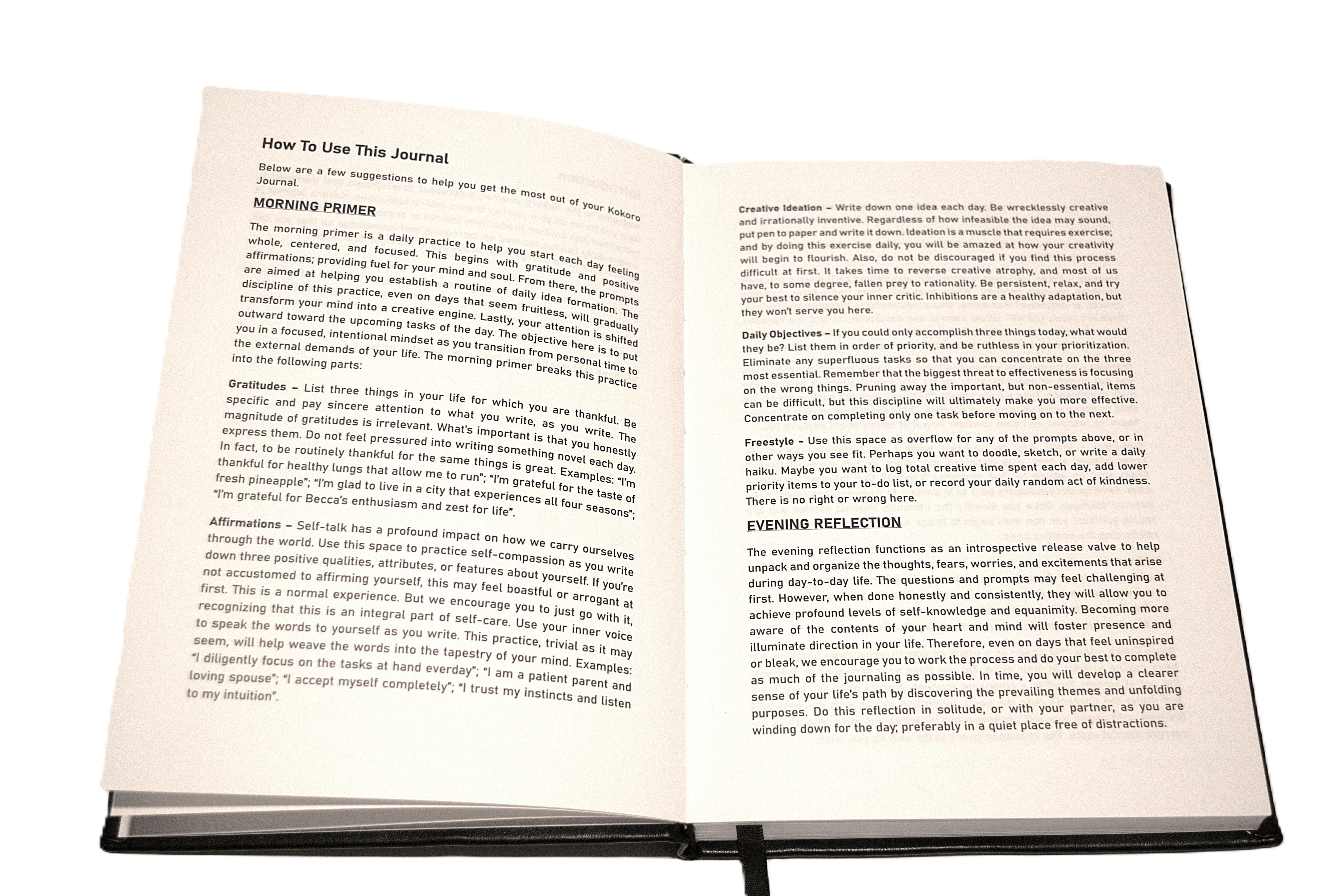 Kokoro Journal's daily Morning Primer and Evening Reflection are thoughtfully designed to help you focus on what truly matters as you start your day, then unwind and recharge as you end it.